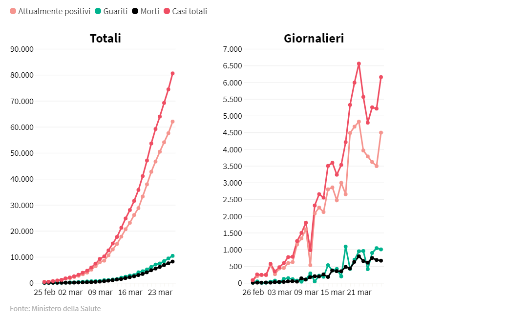 Ranieri Guerra, direttore vicario dell’Oms, a proposito dei dati del 26 marzo ha sottolineato: «Nonostante la leggera crescita, le misure sembrano avere effetto, ma comunque è un momento assolutamente critico: non bisogna abbassare la guardia. Nei prossimi giorni ci aspettiamo un rallentamento della velocità di crescita della curva e una diminuzione della casistica. Spero che ciò accada soprattutto per la casistica grave. Bisogna continuare con le misure di contenimento e distanziamento sociale, ma bisogna anche garantire i servizi a livello domiciliare e anche di carattere psicologico».