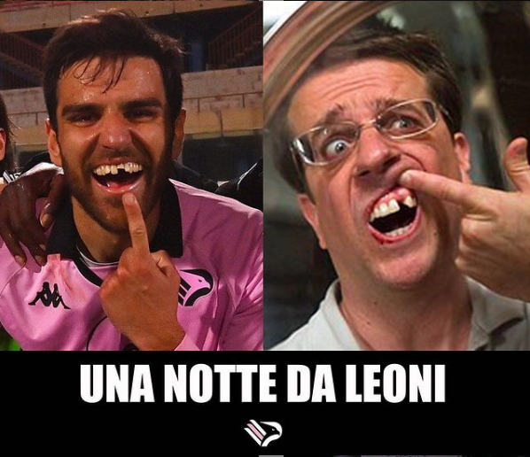 Il Palermo Fc ha pubblicato un simpatico post in cui la foto di Somma viene accostata all’immagine di un celebre film comico americano “Una notte da leoni”. Il calciatore classe ’95, durante uno scontro di gioco con Sarao, ha perso parte dell’incisivo.