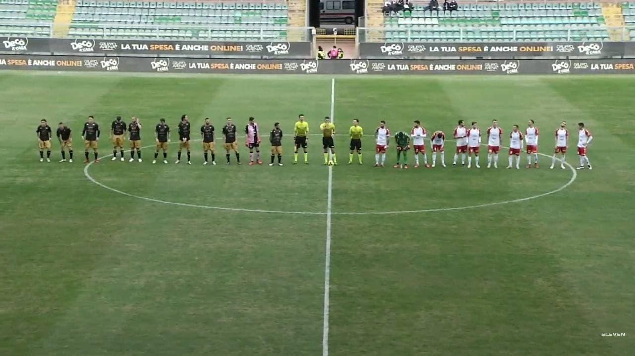 Mignani è costretto a sostituire Paponi con Gigliotti, un difensore. Segno che non si fida di un Palermo che in rimessa sa rendersi pericoloso. E infatti la formazione di Filippi prova a accelerare e arriva al tiro,alto, di Brunori e poi con un cross di Crivello malamente controllato da Soleri; Buttaro prova a approfittare del rimpallo, ma guadagna soltanto un giallo per aver colpito Frattali in scivolata. Il primo tempo si chiude con l’ennesima ripartenza dei rosanero sprecata da un appoggio sbagliato da Silipo per Soleri.